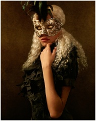 A mysterious woman in a chic masquerade costume with an ornate mask.