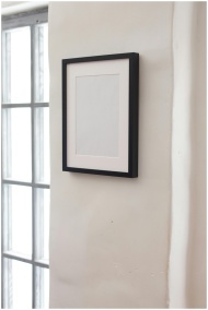 A modern minimalist interior featuring a simple black frame on a white wall.