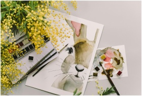 A watercolor painting of a bunny surrounded by mimosa flowers and art supplies.