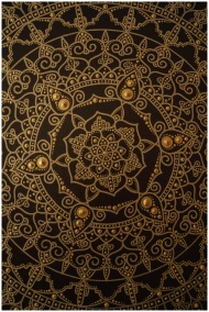 Close-up of ornate mandala design using dot painting technique on canvas, highlighting detailed patterns.