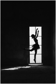 Black and white side view of anonymous female ballet dancer showing choreographic movement with raised leg against door