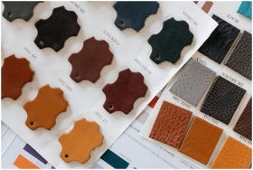 Selection of leather swatches in various colors and textures displayed on paper samples.