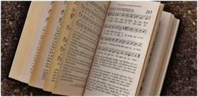 Close-up of an open book displaying musical notes and lyrics on a textured ground surface.