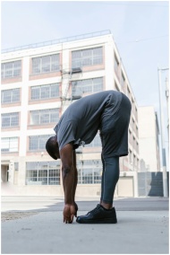 A man stretches outdoors near an urban building, focusing on fitness and flexibility.