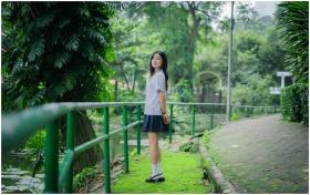 A young woman in a school uniform stands on a green path surrounded by lush vegetation.
