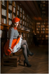 Chic woman in vibrant outfit posing elegantly in a classic library setting. Perfect for fashion and literary themes.