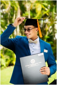 A happy young graduate in a blue suit celebrates outdoors with a diploma and graduation cap.
