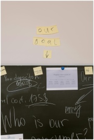 Office brainstorming session with sticky notes and chalkboard scribbles.