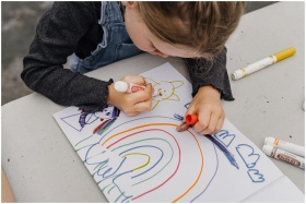 From above of crop concentrated little girl in denim overall drawing picture with color markers