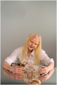 A woman with blonde hair in a studio interacts with toy animals on a reflective surface.