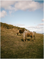 Two horses grazing in a picturesque North Wales fi