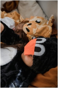 Two children in animal onesies cuddling indoors, enjoying a cozy moment.