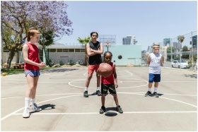 Group of kids enjoying a sunny day on the basketball court, showcasing sports and recreation.