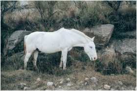 A serene image of a white horse grazing in Córdoba, Argentina, showcasing natural beauty.