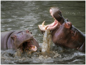 Close-up of two hippopotamuses interacting in a river, showcasing nature and wildlife photography.
