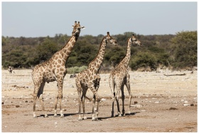 Three giraffes roam the sunlit savanna in Namibia, showcasing wildlife beauty.