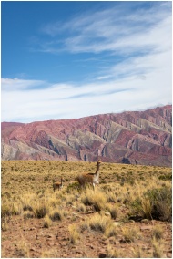 Scenic view of guanacos with the stunningly colorful hills of Humahuaca, Argentina in the background.