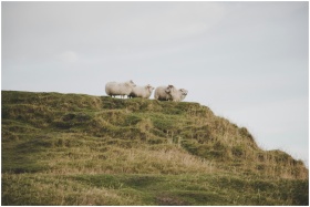 A serene scene of sheep grazing on a verdant hillside under a cloudy sky in Iceland.