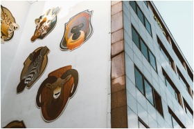 Creative animal mural displayed on the side of a city skyscraper, featuring diverse wildlife.