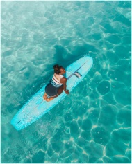 Aerial shot of a woman on a surfboard in clear, turquoise water, conveying a sense of adventure and tranquility.