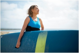 A senior woman in a wetsuit holding a surfboard, e