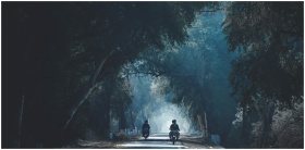 Two motorcyclists journey through a serene forest road enveloped in nature.