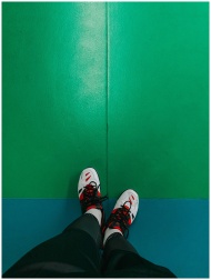 Person wearing trendy sneakers on a vibrant indoor