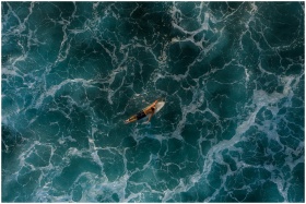 An aerial shot capturing a lone surfer navigating