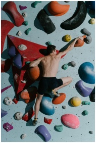 Shirtless man engages in indoor rock climbing, sho