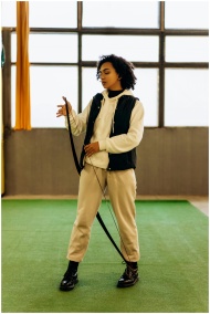 Confident young woman practicing archery indoors, showcasing focus and determination.