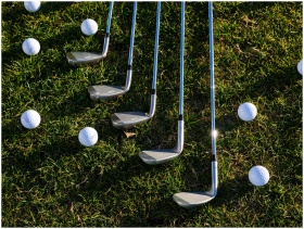 Flat lay of golf clubs and balls arranged on green grass, perfect for sports enthusiasts.
