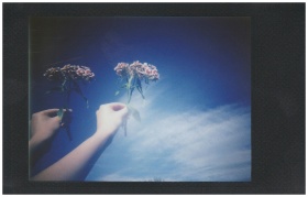 Creative double exposure featuring hands holding flowers against a bright blue sky.