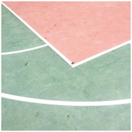 A vibrant pastel basketball court featuring green and pink sections with white lines.