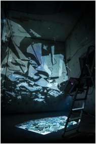 Broken glass and light reflections create abstract art in a dark room.
