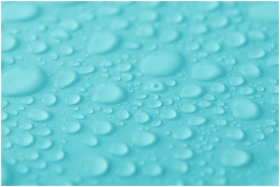Macro shot of water droplets on a vibrant turquoise surface, showcasing texture and clarity.