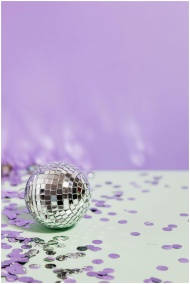 Silver disco ball amid vibrant purple and green confetti with a light purple background