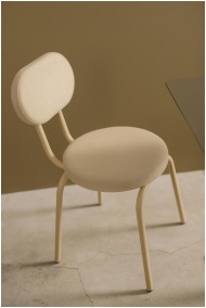 A simple beige chair in a minimalistic setting with a glass accent table and concrete floor.