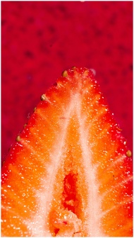 Vibrant close-up of a sliced strawberry highlighting its juicy texture against a red backdrop.