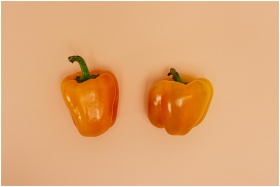 Two fresh yellow bell peppers isolated on a soft peach background in a minimalist style.