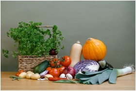 A vibrant display of fresh vegetables including tomatoes, squash, and parsley.