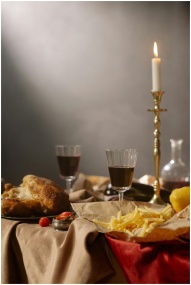 Cozy candlelit dinner setup with wine, roast chick