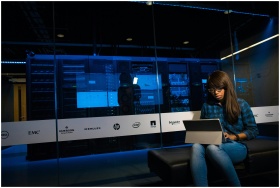 Woman using a laptop in a server room, showcasing