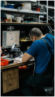 Technician focused on computer repair in cluttered workshop setting.