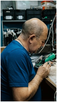 Skilled technician working meticulously on electronics in workshop. Tools and cables visible.
