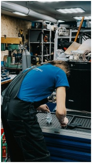 A technician repairs equipment in a cluttered workshop setting. Industrial tools surround them.