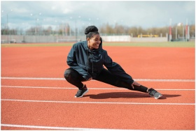 A woman in activewear stretches on a red running track outdoors, preparing for a workout.