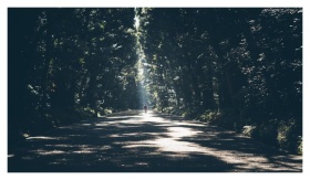A tranquil forest road with golden sunlight filter