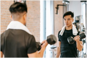 Active Asian male with towel lifting heavy dumbbel
