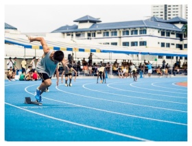 Athletes burst from the blocks during a sprint rac