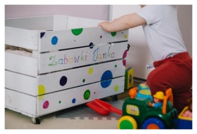 Cute baby standing by a stool indoors with a playf
